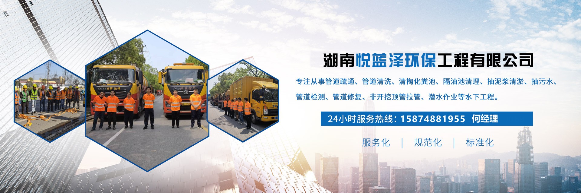 湖南悦蓝泽环保工程有限公司专业从事管道疏通、管道清洗、清掏化粪池、隔油池清理、抽泥浆清淤、抽污水、管道检测、管道修复、非开挖顶管拉管、潜水作业等水下工程。拥有多名经过培训的技术人员,具有丰富的施工经验,配有大型管道高压清洗车、疏通机、大、小抽粪车及相关大型配套设备,并不断在技术、人员和设备上加大投入和改进。