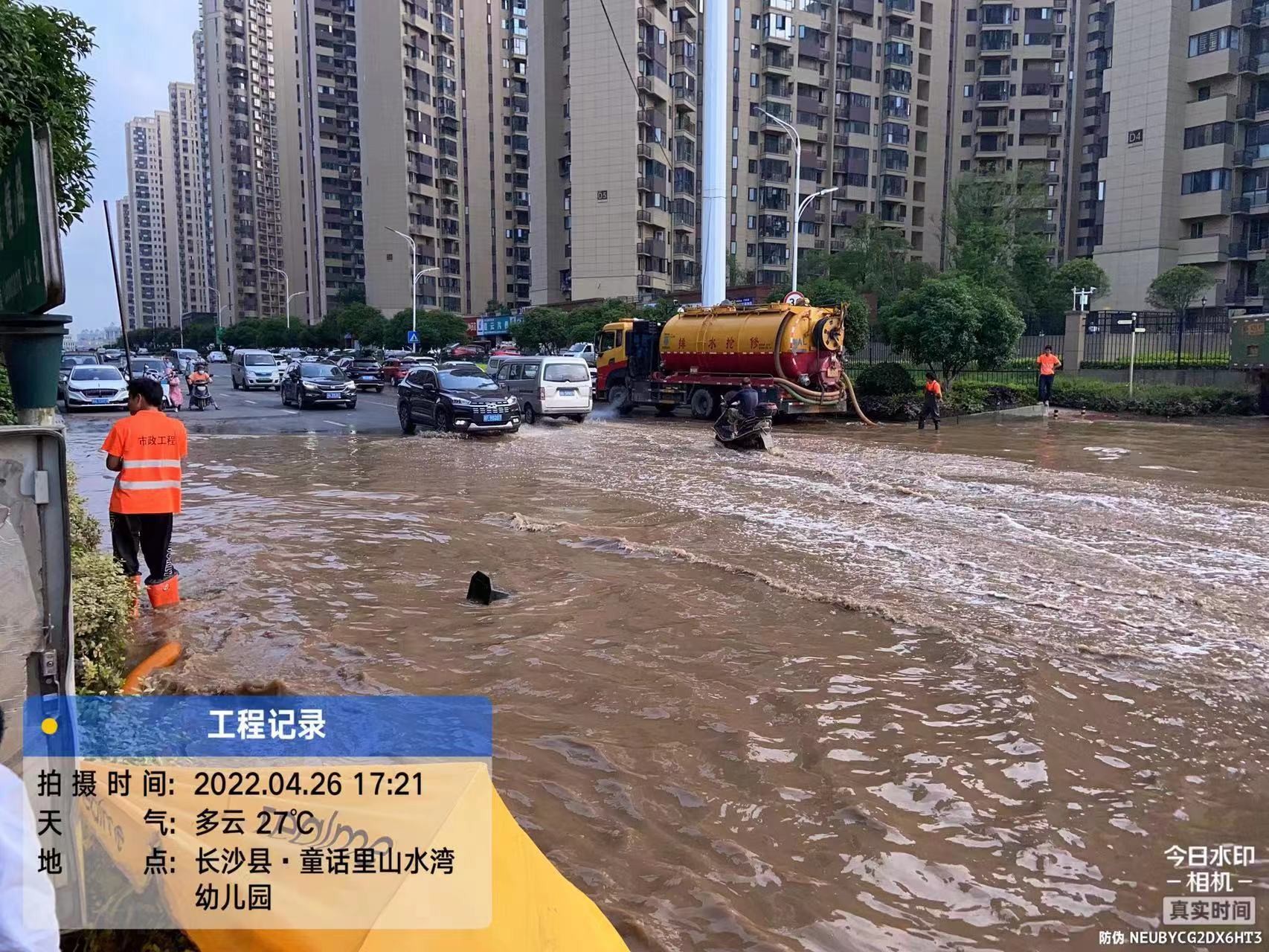 现场下水道的疏通,必要时启用潜水泵和挖掘机、装载机等进行抢险排洪。